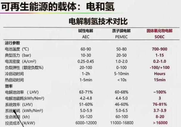 我國有成本優(yōu)勢的是堿性電解,現(xiàn)在商用的是質子膜電解,未來發(fā)展是效率更高的固體氧化電解。