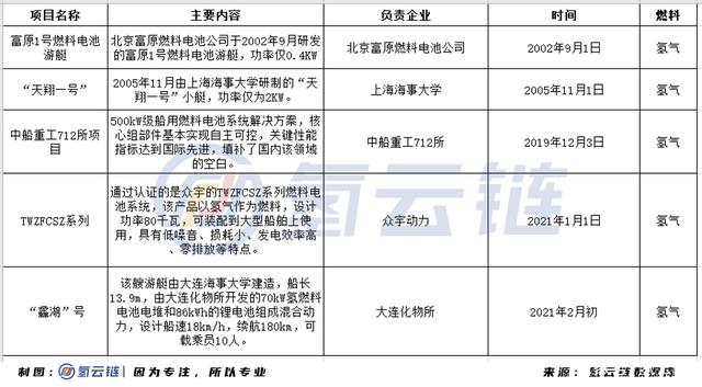 據氫云鏈數據庫統計,國內的燃料電池船舶研究起步較晚,二十年僅有5個可參考的案例。直至近期,國內燃料電池船舶在動力系統認證和整船方面同時發展迎來實質性的突破。