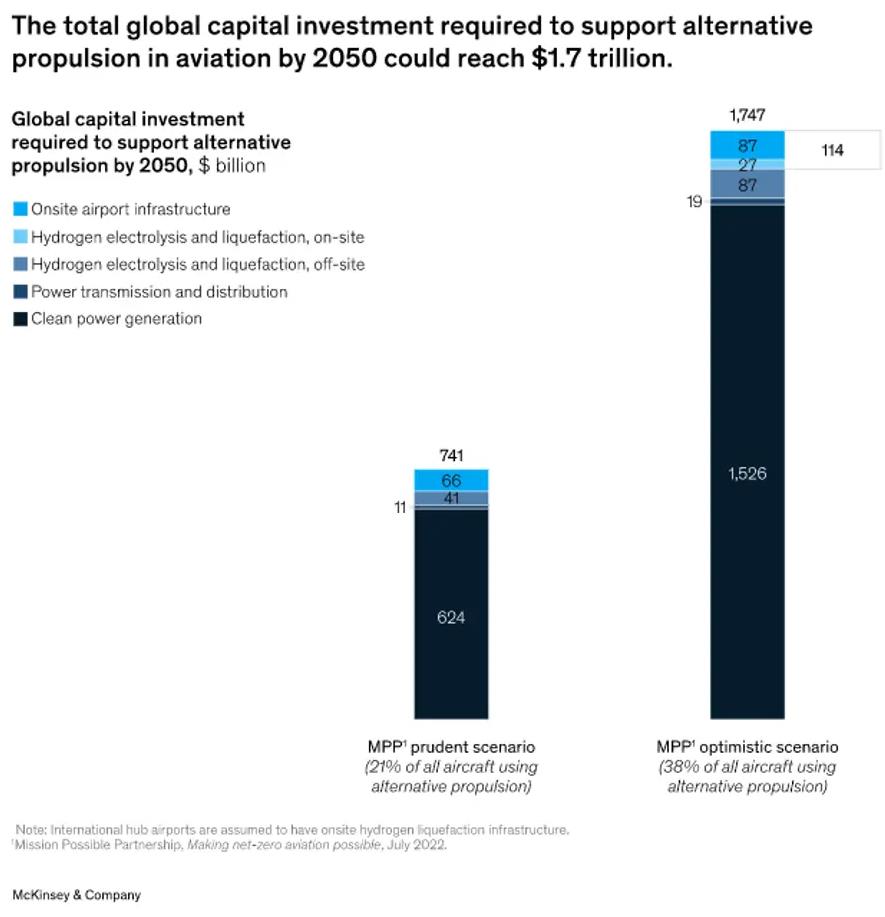 “為實現2050年與替代動力相關的基礎設施目標所需的投資必須從現在開始”,報告警告道。到2050年轉向替代動力將需要在整個價值鏈上進行7000億美元至1.7萬億美元的資本投資。其中約90%的投資將用于非機場基礎設施,主要是發電和氫氣電解液和液化。