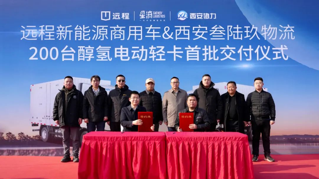 2023年12月19日,遠程新能源商用車與西安叁陸玖物流簽署200臺醇氫電動輕卡訂單,并成功舉辦首批車輛交付儀式。