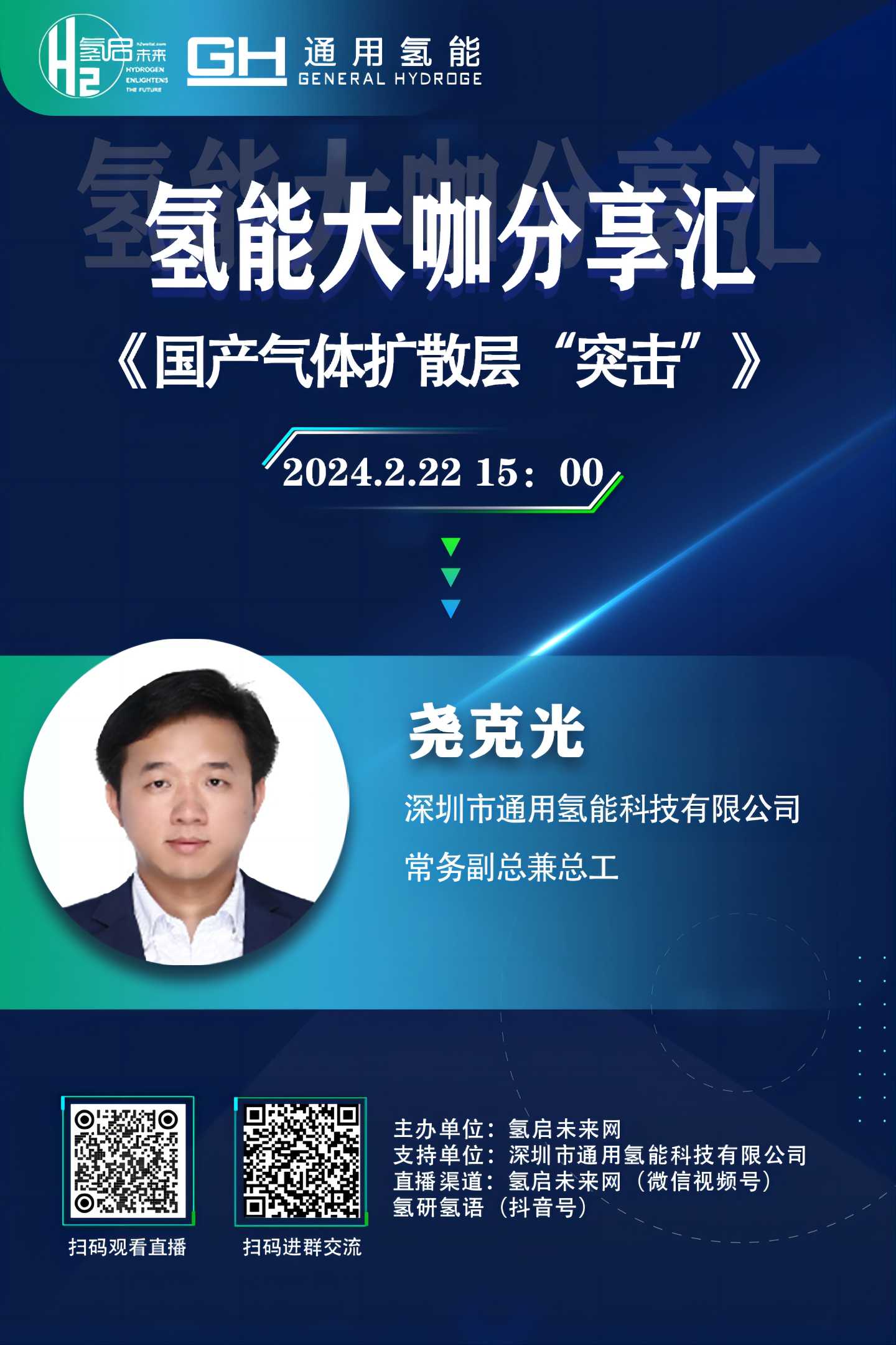 由氫啟未來網主辦的直播欄目《氫能大咖分享匯》即將于2月22日迎來深圳市通用氫能科技有限公司常務副總兼總工堯克光的精彩分享。