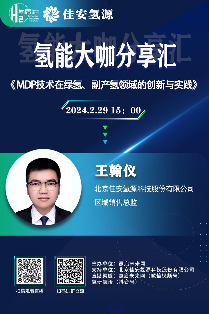 由氫啟未來(lái)網(wǎng)主辦的直播欄目《氫能大咖分享匯》,將于2月29日邀請(qǐng)北京佳安氫源科技股份有限公司區(qū)域銷(xiāo)售總監(jiān)王翰儀,進(jìn)行《MDP技術(shù)在綠氫、副產(chǎn)氫領(lǐng)域的創(chuàng)新與實(shí)踐》分享。
