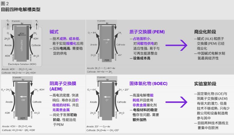 電解槽是綠氫制備的關鍵設備,其技術路線、性能、成本是影響綠氫市場走勢的重要因素。目前,堿式(AE)電解槽與質子交換膜(PEM)電解槽較為成熟,已經商業化。而有很大發展潛力的陰離子交換膜(AEM)電解槽與固體氧化物(SOEC)電解槽仍處于實驗室階段,技術不夠成熟(如圖2)。
