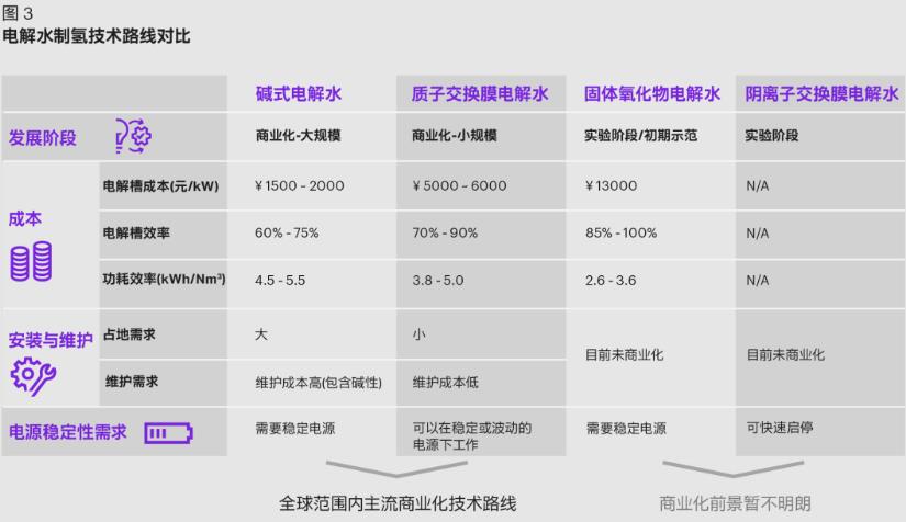 具體來看,堿式(AE)電解槽和質子交換膜(PEM)電解槽是目前全球和中國范圍內具備商業化能力的唯二路徑,且各有千秋。而對于中國來說,堿式電解水制氫最具經濟性(如圖3)。