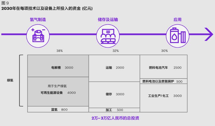 為了形成有效的氫能源體系,提高氫能的技術經濟性,針對技術、設備和材料的大規模投資必不可少(如圖9)。這其中,科爾尼認為,綠氫的生產、儲存以及供給,和燃料電池是未來十年的發展重點。