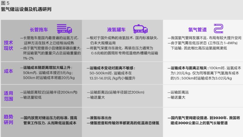 在氫氣運輸方面,同樣根據氫氣狀態不同,可以分為氣態氫氣輸送、液態氫氣輸送和固態氫氣輸送三種類型,主要的運輸方式有長管拖車、液氫罐車、管道運輸。長管拖車是中國氫氣運輸的主要方式,所需的運輸成本與基礎設施投入相對較低,但運輸規模與運輸半徑較為有限;液氫罐車將在液態儲氫技術發展的基礎之上逐漸成熟;氫氣管道運輸將是中長期氫氣運輸的重要組成部分(如圖5)。