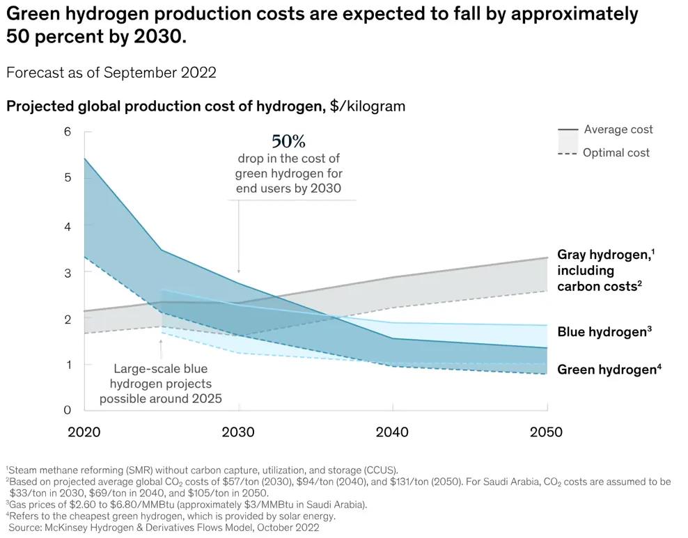 為了實(shí)現(xiàn)HRC的氫氣承諾,將需要擴(kuò)大藍(lán)氫和綠氫的競爭供應(yīng)。隨著電解槽成本的下降,預(yù)計(jì)到2030年,綠氫成本將下降約50%。