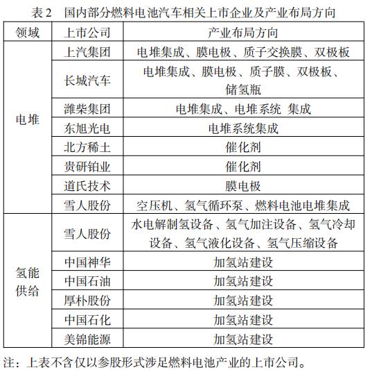 2017 年以來,上汽集團、濰柴集團、長城集團、雪人 股份等國內大型企業紛紛調整業務戰略或增加業務版塊,快 速布局氫能與氫燃料電池核心零部件產業,其中上市公司超 過 30 家。大型企業集團進入燃料電池核心零部件產業,憑 借資金實力和渠道優勢以及大規模的研發和產業投入,加速 了產業鏈的構建和集聚,加快了燃料電池汽車國產重要部件 性能提升和規模化生產的時間表。國內部分燃料電池汽車相 關上市企業及產業布局方向如表 2 所示。