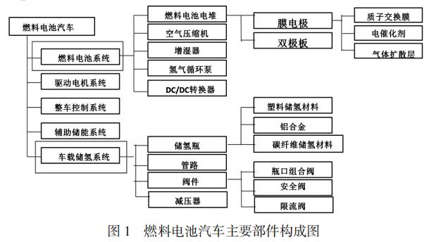 燃料電池汽車產業鏈主要包含上游(燃料電池動力系統 及關鍵部件)和下游(整車生產)兩大部分。與傳統汽車產 業鏈相比,燃料電池汽車產業鏈主要新增了燃料電池系統和 車載供氫系統,其中燃料電池系統是核心結構。主要部件構 成如圖 1 所示。