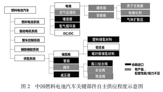 如圖 2 所示,圖中黑色陰影部分的產品是目前國內產業 空白,完全依賴進口的產品,灰色陰影部分代表國內雖然有 相應產品,但由于性能不足或車標配套能力不足,目前階段 也主要依賴于進口的領域,在燃料電池汽車核心部件方面, 中國目前主要掌握的是電堆和電堆系統的集成、車載儲氫瓶 的集成。