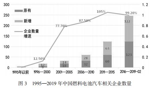 圖 3 給出了 1995—2019 年中國燃料電池汽車相關企業 數量。截至 2019-02,中國燃料電池汽車相關企業數量近 250 家,其中近三年來相關企業數量增速加快,并初步形成了長 三角、華南及環京幾大產業集聚區。另外,中部、西部、東 北一些電動汽車產業相對落后,或工業副產氫以及光電水電 資源較為豐富,以及氣候極寒等地區,也是布局燃料電池汽 車產業的重要區域。