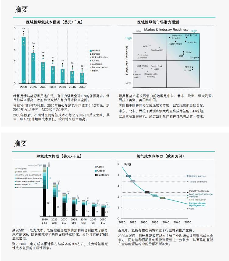 2. 根據我們的模型預測,2020年綠氫成本每公斤4.2美元,2030年為1.9美元,2050年為1美元。分區域的綠氫價格介于0.8美元到1.3美元之間,中東/北非價格最低,歐洲價格最高。
