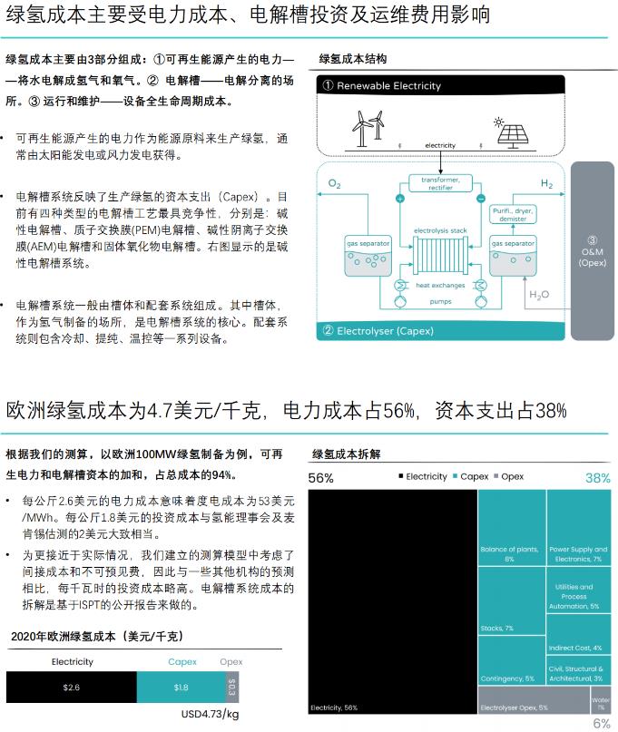 5. 2020年生產綠氫的電力成本平均為44美元/兆瓦時,占到總成本的56%,平準化度電成本在近幾年將大幅下降,之后趨于平穩。2050年電力成本預計為17美元/兆瓦時,占到生產綠氫總成本的70%,因此電力成本差異將直接導致綠氫成本存在地區性差異。