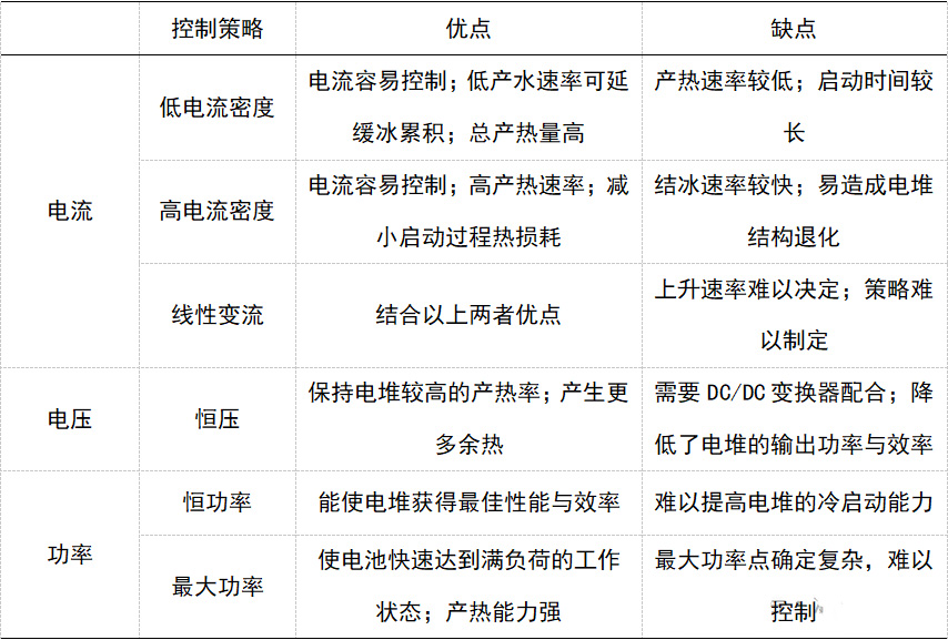 控制策略優點缺點電流低電流密度電流容易控制;低產水速率可延緩冰累積;總產熱量高產熱速率較低;啟動時間較長高電流密度電流容易控制;高產熱速率;減小啟動過程熱損耗結冰速率較快;易造成電堆結構退化線性變流結合以上兩者優點上升速率難以決定;策略難以制定電壓恒壓保持電堆較高的產熱率;產生更多余熱需要DC/DC變換器配合;降低了電堆的輸出功率與效率功率恒功率能使電堆獲得最佳性能與效率難以提高電堆的冷啟動能力最大功率使電池快速達到滿負荷的工作狀態;產熱能力強最大功率點確定復雜,難以控制。