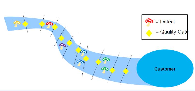 好的質量管理流程:如圖所示各工序節點之間設置質量門(QG),每道工序產生的的缺陷被阻止在本道工序,同時通過現場的快速反應解決問題,最終實現零缺陷/很少缺陷流出到客戶端,客戶滿意度得到提升。