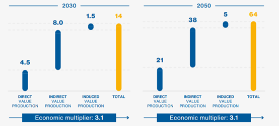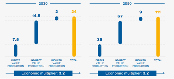 如果我們分析加速發展的情景,這些影響更為顯著,即供應鏈的總價值在2030年達到75億歐元,在2050年達到350億歐元,2020-2050年的累計價值超過4750億歐元。