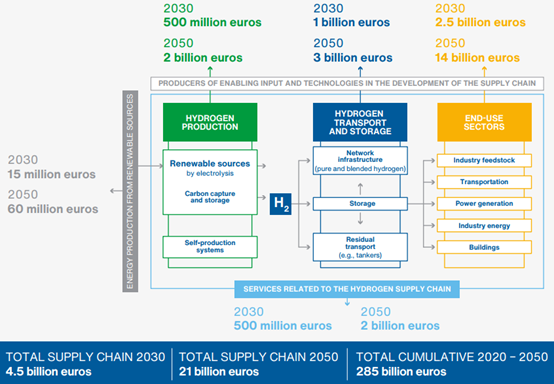 在發展情景中,氫供應鏈的總價值在2030年為45億歐元,在2050年為210億歐元,2020-2050年期間的總價值為2850億歐元。