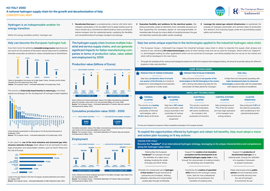 I.支持意大利作為歐洲氫能戰略指揮者的作用,利用意大利在氫能價值鏈上的獨特能力,通過尖銳的工業發展愿景和由政府在機構廣泛參與下起草的國家氫能戰略,能源、制造業和學術利益相關者。這必須首先確定一個長期的能源遠景,更新和擴大國家能源和氣候綜合計劃的基礎就是這個遠景。此外,意大利必須致力于在歐洲清潔氫聯盟中占據前沿地位,推動建立符合國家需求、有利于意大利供應鏈發展的歐洲項目