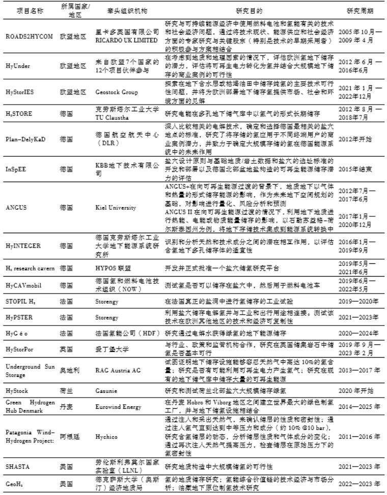1979年美國天然氣技術研究院發表了地下儲氫研究報告,證實了其經濟和技術上的可行性。1986年,根據Taylor等人研究,地下儲氫是最經濟的儲氫方法。此外表1也展示一些項目研究證明其可行性。