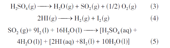 其中,“aq”表示水溶液。反應(yīng)(3)是硫酸(H2SO4)分解反應(yīng),在氣相中熱分解H2SO4產(chǎn)生氧氣,反應(yīng)(4)是碘化氫(HI)分解反應(yīng),在氣相中熱分解HI產(chǎn)生氫氣。反應(yīng)(5)稱為本生反應(yīng),是水、二氧化硫和碘反應(yīng)生成硫酸和HI的一種液相反應(yīng)。本生反應(yīng)中產(chǎn)生的H2SO4和HI可以通過液-液相分離現(xiàn)象分離為上層液相和下層液相。