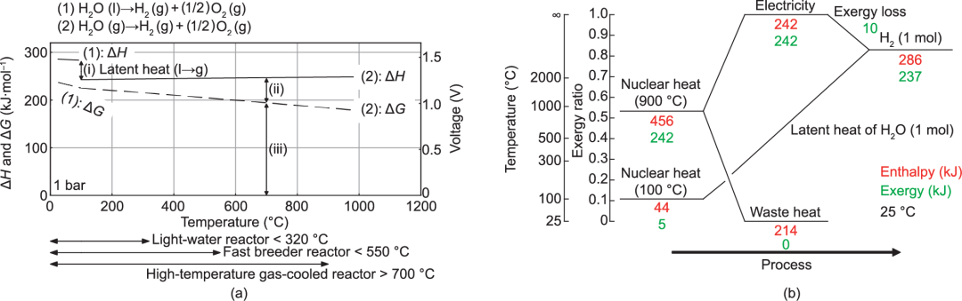 圖3.(a)水分解反應(yīng)的ΔH-T和ΔG-T圖;(b)高溫蒸汽電解的能量轉(zhuǎn)換圖。