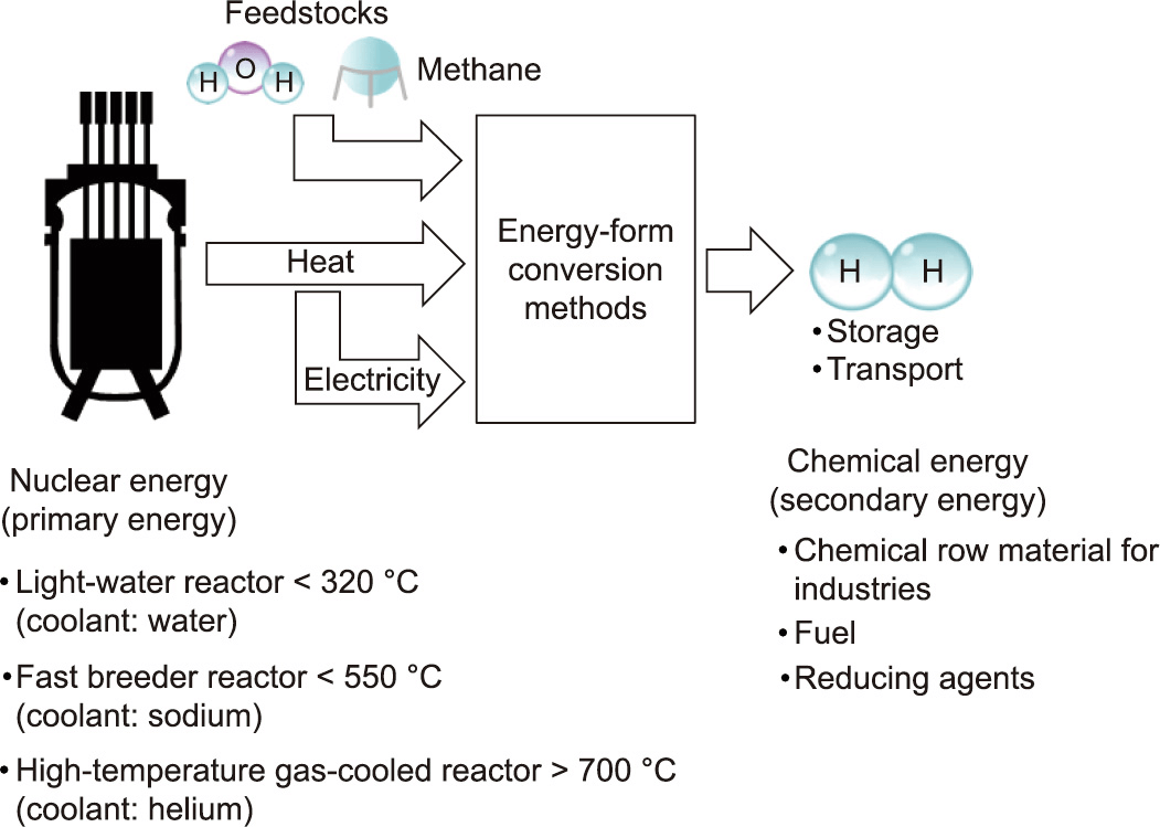 圖1展示了利用核能制氫所涉及的能量形式轉(zhuǎn)換。作為二次能源,氫氣可以通過將水或碳氫化合物(化石資源)作為原料加入核能(一次能源)來生產(chǎn)。也就是說,這個過程將核能轉(zhuǎn)化為氫氣的化學能。產(chǎn)生熱能的核反應(yīng)堆包括以下反應(yīng)堆類型,每個反應(yīng)堆的熱能可用溫度從低到高排序:輕水反應(yīng)堆(冷卻劑:水);快中子增殖反應(yīng)堆(冷卻劑:鈉),以及高溫氣冷反應(yīng)堆(冷卻劑:氦氣)。