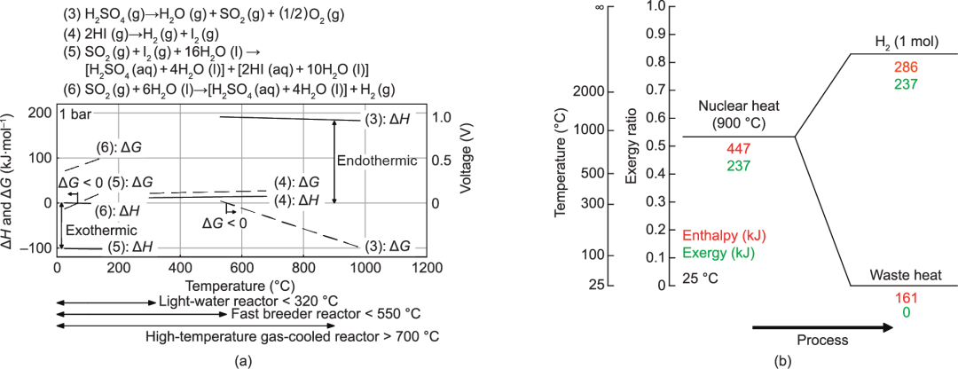 圖4.(a)熱化學循環(huán)反應(yīng)的ΔH-T和ΔG-T圖;(b)熱化學循環(huán)的能量轉(zhuǎn)換圖(碘硫過程和混合硫過程)。