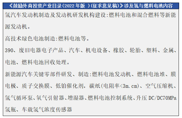 2022年,國家發展改革委、商務部就《鼓勵外商投資產業目錄(2022年版)(征求意見)》公開征求意見。其中多項涉及燃料電池電堆方面。