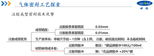 相比較之前兩個版本的工藝,注膠成型工藝在成型精度、生產效率和材料的綜合成本上進行了很大的優化。注膠工藝在流程上有所縮短,原料價格更低,成型精度可以做到小于0.02mm,低于點膠成型固化膠條能做到的0.03mm。