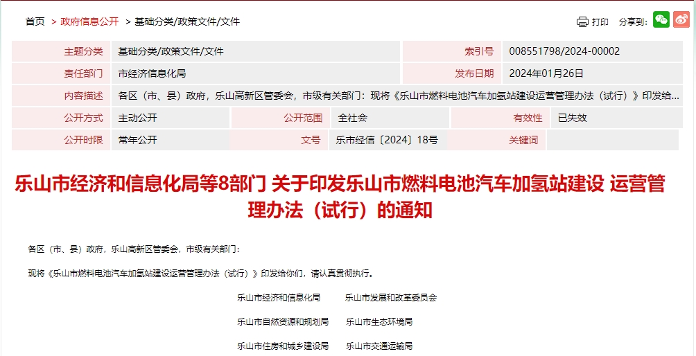 氫啟未來網(wǎng)獲悉,2024年1月26日,四川省樂山市經(jīng)濟(jì)和信息化局等8部門聯(lián)合發(fā)布關(guān)于印發(fā)《樂山市燃料電池汽車加氫站建設(shè)運(yùn)營(yíng)管理辦法(試行)》(以下簡(jiǎn)稱:試行辦法)的通知。
