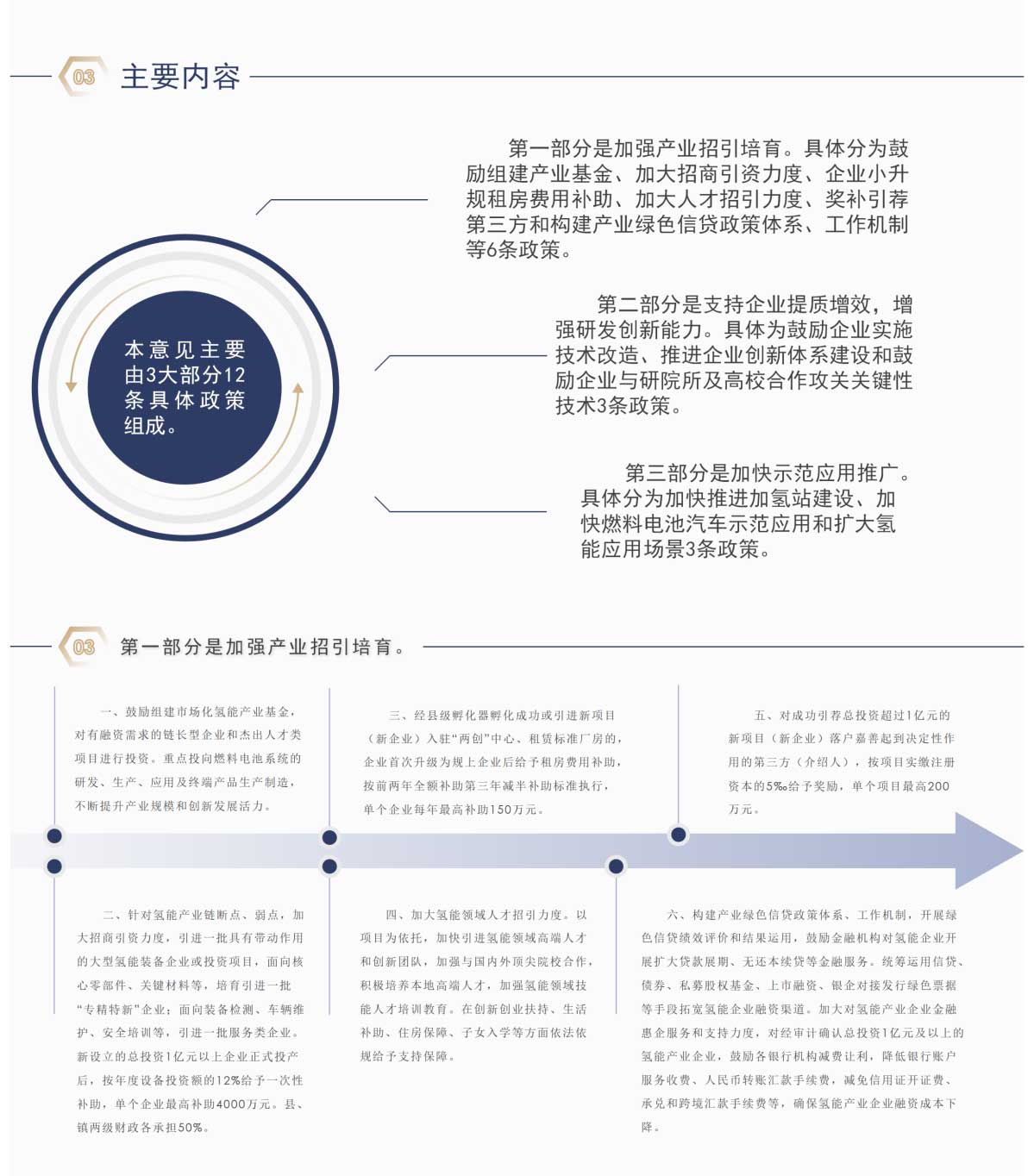 (一)成立氫能產(chǎn)業(yè)發(fā)展專項(xiàng)基金。基金總規(guī)模10億元,首期募集金額不少于2億元。 | 一、鼓勵(lì)組建市場(chǎng)化氫能產(chǎn)業(yè)基金,對(duì)有融資需求的鏈長(zhǎng)型企業(yè)和杰出人才類項(xiàng)目進(jìn)行投資。重點(diǎn)投向燃料電池系統(tǒng)的研發(fā)、生產(chǎn)、應(yīng)用及終端產(chǎn)品生產(chǎn)制造,不斷提升產(chǎn)業(yè)規(guī)模和創(chuàng)新發(fā)展活力。 | 將成立氫能產(chǎn)業(yè)發(fā)展專項(xiàng)基金修改為鼓勵(lì)組建市場(chǎng)化氫能產(chǎn)業(yè)基金。 |