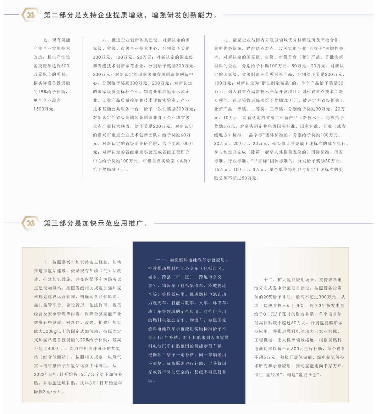 (十一)對(duì)加氫站建設(shè)的主體,按實(shí)際設(shè)備投資額(經(jīng)審計(jì)確認(rèn)的不含稅投資額)的20%給予一次性補(bǔ)助。 | 十、按照嘉興市加氫站布點(diǎn)規(guī)劃,加快推進(jìn)加氫站建設(shè),鼓勵(lì)現(xiàn)有加油(氣)站改建、擴(kuò)建加氫設(shè)施,并在內(nèi)循環(huán)車輛場(chǎng)所試點(diǎn)建設(shè)加氫站。按照省級(jí)相關(guān)規(guī)定加強(qiáng)加氫站規(guī)劃建設(shè)運(yùn)營(yíng)管理,明確運(yùn)營(yíng)監(jiān)管原則、部門監(jiān)管職責(zé)、建設(shè)管理、依法許可、規(guī)范經(jīng)營(yíng)及安全管理等內(nèi)容,保障全縣氫能產(chǎn)業(yè)健康有序發(fā)展。對(duì)新建、改建、擴(kuò)建日加氫能力500kg以上的固定式加氫站,按照固定式加氫站設(shè)備投資額的20%給予補(bǔ)助,最高不超過400萬元。對(duì)取得相關(guān)許可證的加氫站(綜合能源站),按照相關(guān)規(guī)定,以氫氣實(shí)際銷售量給予加氫站運(yùn)營(yíng)主體補(bǔ)助。從2022年3月1日開始按15元/公斤給予加氫補(bǔ)貼,并實(shí)施退坡補(bǔ)貼,次年3月1日開始逐年降低3元/公斤。 | 調(diào)整了對(duì)加氫站建設(shè)的補(bǔ)助,設(shè)置了補(bǔ)助上限400萬元。同時(shí)新增了對(duì)加氫站售氫補(bǔ)助。 |