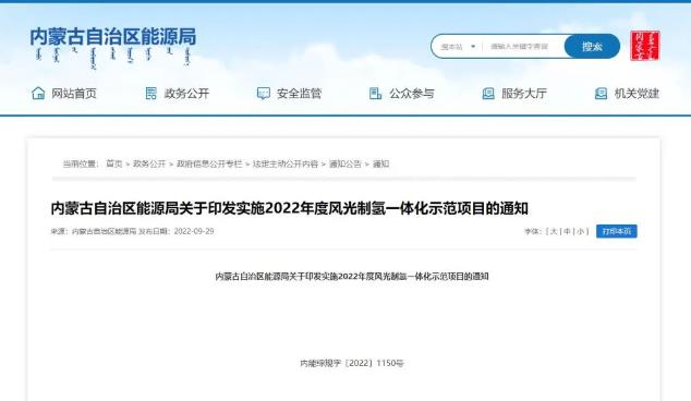 內(nèi)蒙古自治區(qū)能源局關(guān)于印發(fā)實(shí)施2022年度風(fēng)光制氫一體化示范項(xiàng)目的通知