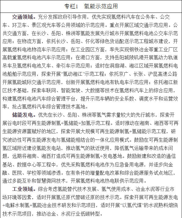 在氫能產業發展培育期,充分發揮示范應用的引領作用,積極開展氫能示范城市建設,爭取氫能交通、可再生能源制氫等領域國家級氫能應用示范項目落地湖南,著力研究合理的氫能產業發展商業化模式,積極探索拓展氫能多元化發展空間。