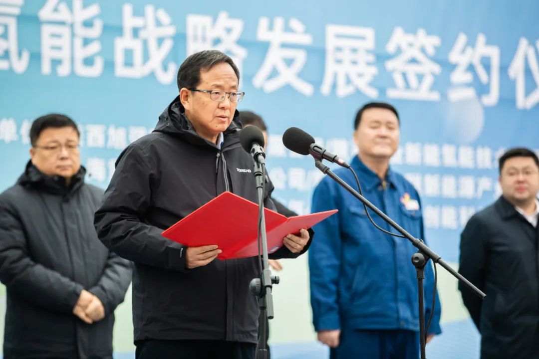 陜西省能源局副局長劉齊,韓城市委副書記張景鋒,韓城市政府黨組成員、副市長郭繼鋒,陜西省工業和信息化廳原材料工業處副處長謝韜,陜鋼集團副總經理韋武強、龍鋼公司黨委書記、董事長陳驍、維納氫能執行董事宋琦、旭強瑞公司總經理王進輝等氫能企業代表共同出席。