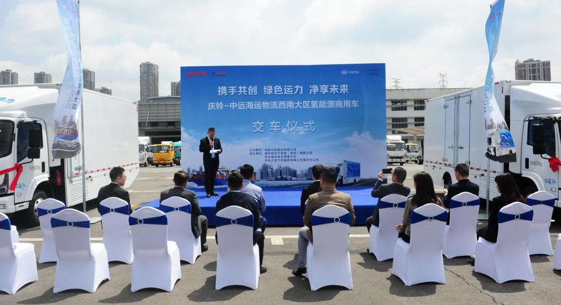 4月25日,慶鈴汽車與中遠(yuǎn)海運(yùn)物流西南大區(qū)首批10輛氫燃料電池汽車交付儀式在慶鈴舉行。