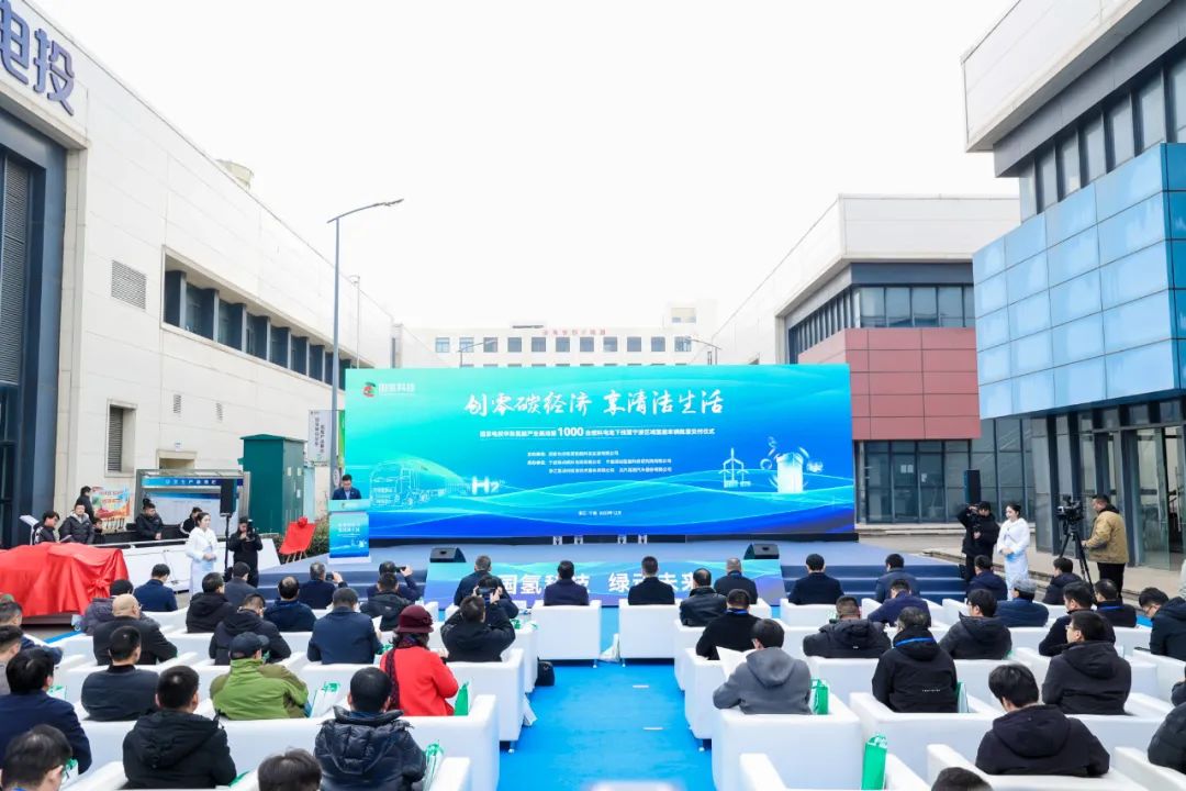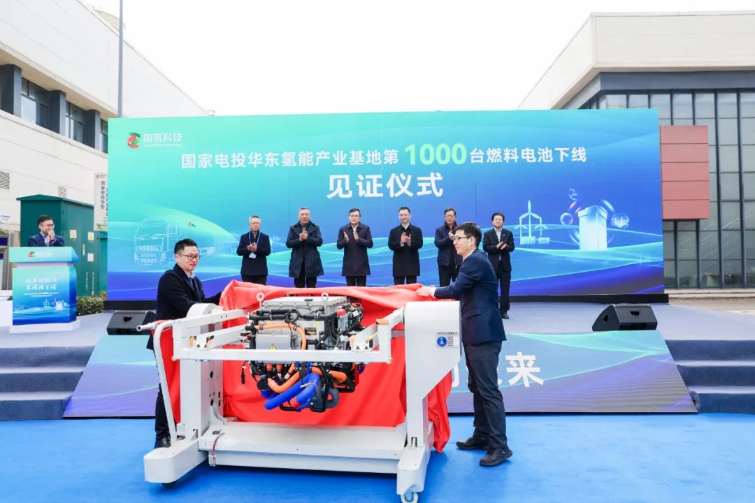 在儀式上,與會嘉賓共同見證了國家電投華東氫能產業基地第1000臺燃料電池下線。國家電投華東氫能產業基地自2019年落地浙江寧波以來,完成了一期工程與二期產能第一階段建設。目前已建成年產3000套鈦基雙極板及電堆、系統組裝產線,投運燃料電池工程測試中心(一期),是國內率先具備鈦基雙極板量產能力的企業,可生產80-150kW的燃料電池電堆和65-120kW的燃料電池動力系統。