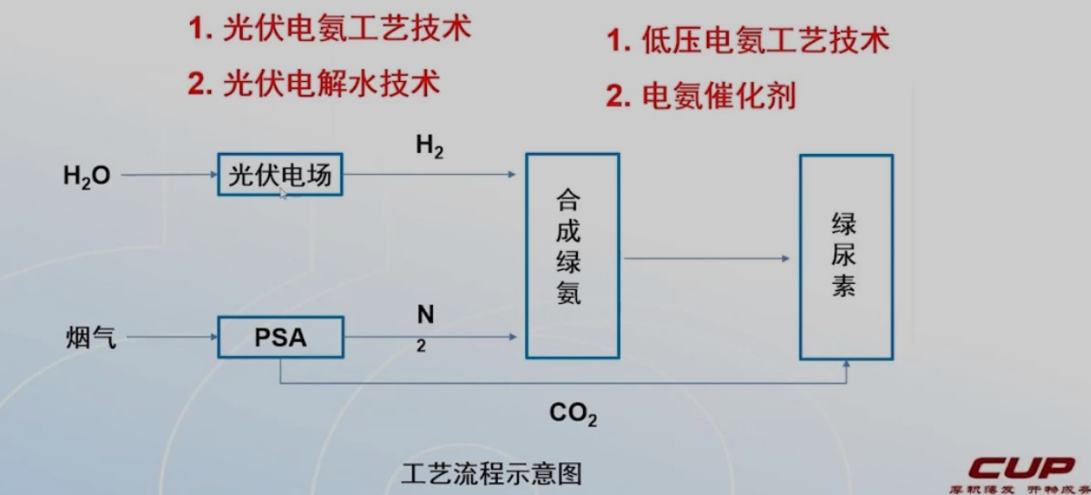 根據(jù)上圖可以看出,利用水通過電解水制氫得到氫氣,再把一些煙氣通過變壓吸附得到氮?dú)夂投趸迹瑲錃飧獨(dú)饩褪呛铣砂保迸c二氧化碳可以做尿素,這個(gè)過程可以不消耗任何的化石能源,完全利用綠電,包括合成氨的反應(yīng)過程也可以用電加熱的方式,原來一個(gè)高能耗、高排放的過程就變成低能耗甚至沒有排放的綠色過程。