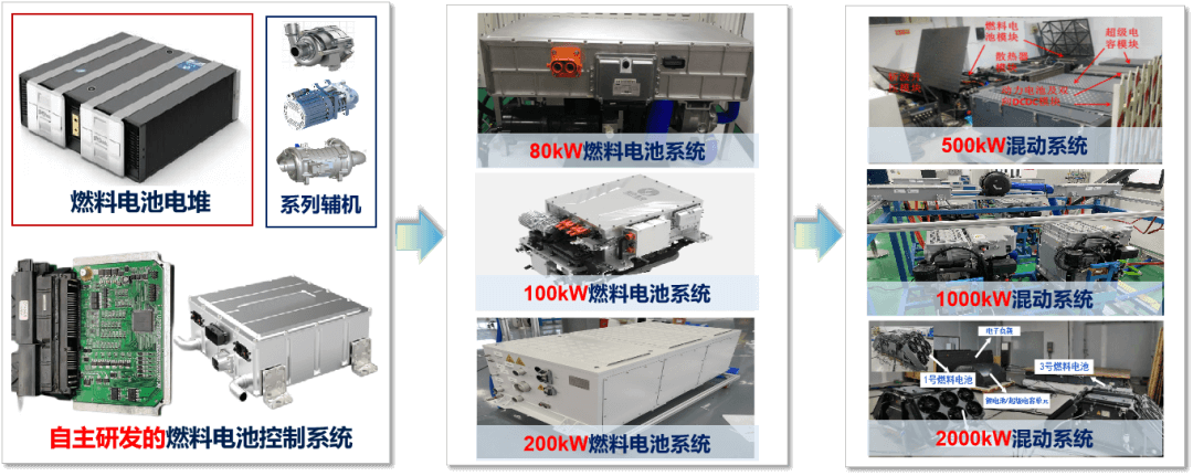 得益于上述技術的發展,陳維榮院士帶領團隊研發出了百kW~MW級系列化氫燃料電池混合動力系統核心產品,大功率燃料電池系統和多堆混動系統的額定功率可達2MW,峰值功率可達4MW,系統最高效率可達64.47%(含DC/DC)。