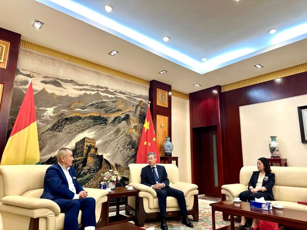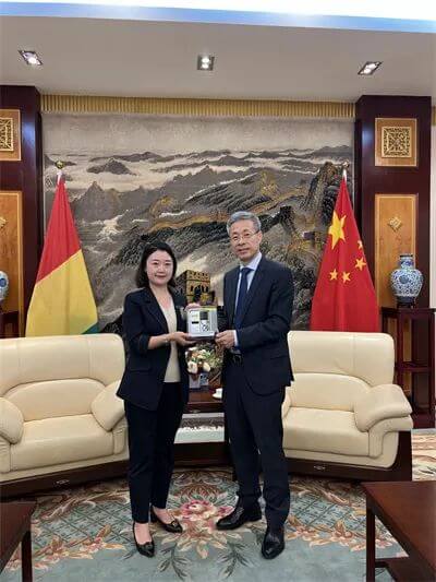 考察團首站是西部非洲幾內亞,抵達首都科納克里當日,拜會了中華人民共和國駐幾內亞大使館。黃巍大使和蔡亮公參一行接見了考察團全體成員,江四元董事長介紹了上海市湖北商會的大體情況、考察團成員和企業狀況。黃巍大使對考察團赴幾內亞投資考察表示熱烈歡迎,并就中幾關系、幾內亞投資環境、人文做了介紹,希望企業家們在幾內亞能夠找到自己感興趣的投資方向。蒲紅霞董事長就羚牛氫能已開展和未來計劃開展的工作與大使和公參進行交流。