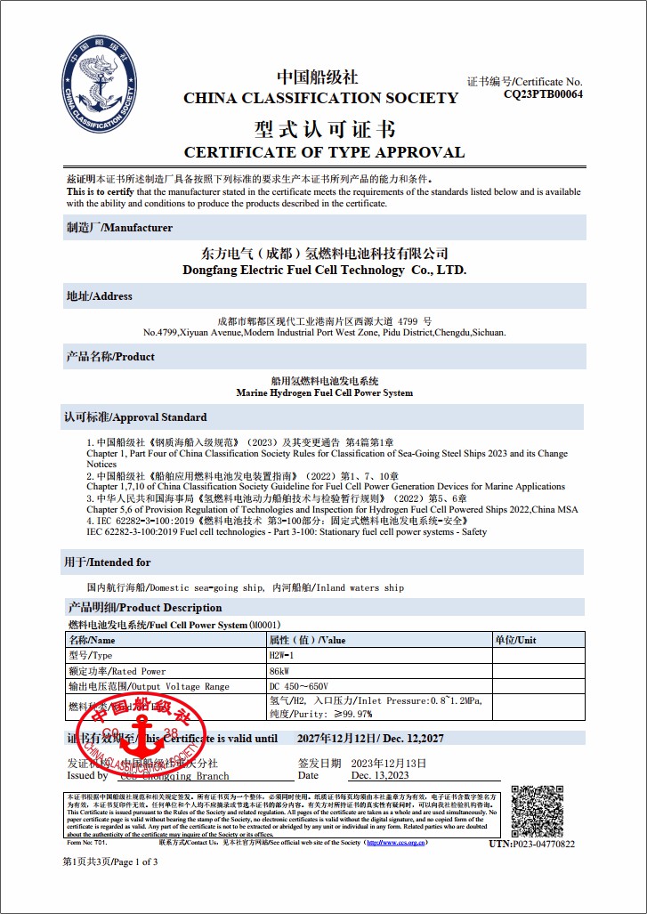 [ 導讀 ]近日,由東方鍋爐所屬子企業東方氫能自主研發的船用燃料電池發電系統獲得中國船級社(CCS)型式認可證書,東方氫能是中國西部...