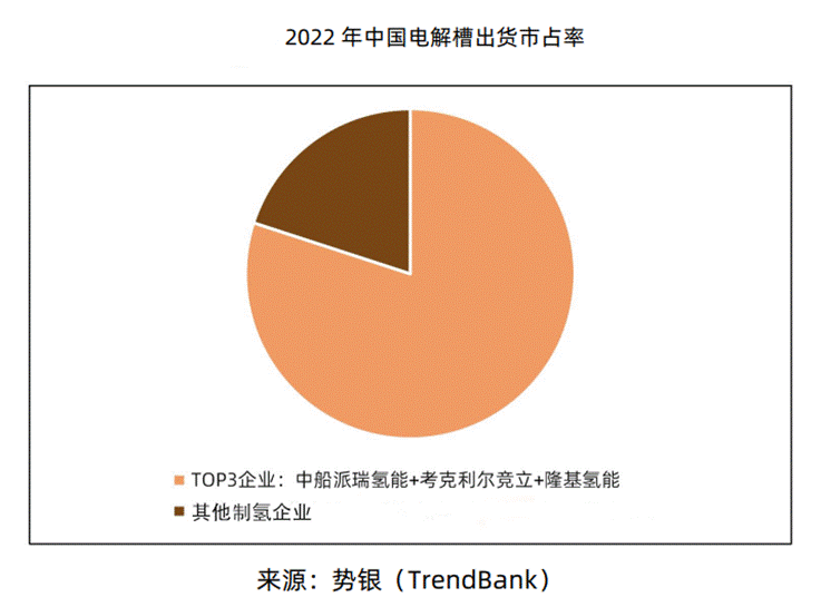 當前,我國電解水制氫技術處于全球領先行列。報告顯示,頭部電解水制氫裝備制造企業的市場占有率較高,市場相對集中。2022年中國堿性電解水制氫設備的出貨量約776MW,電解槽總出貨量在800MW左右,在2021年基礎上實現翻番。Top3企業電解槽總市場占有率占80%,其中,隆基氫能出貨躋身全國前三。