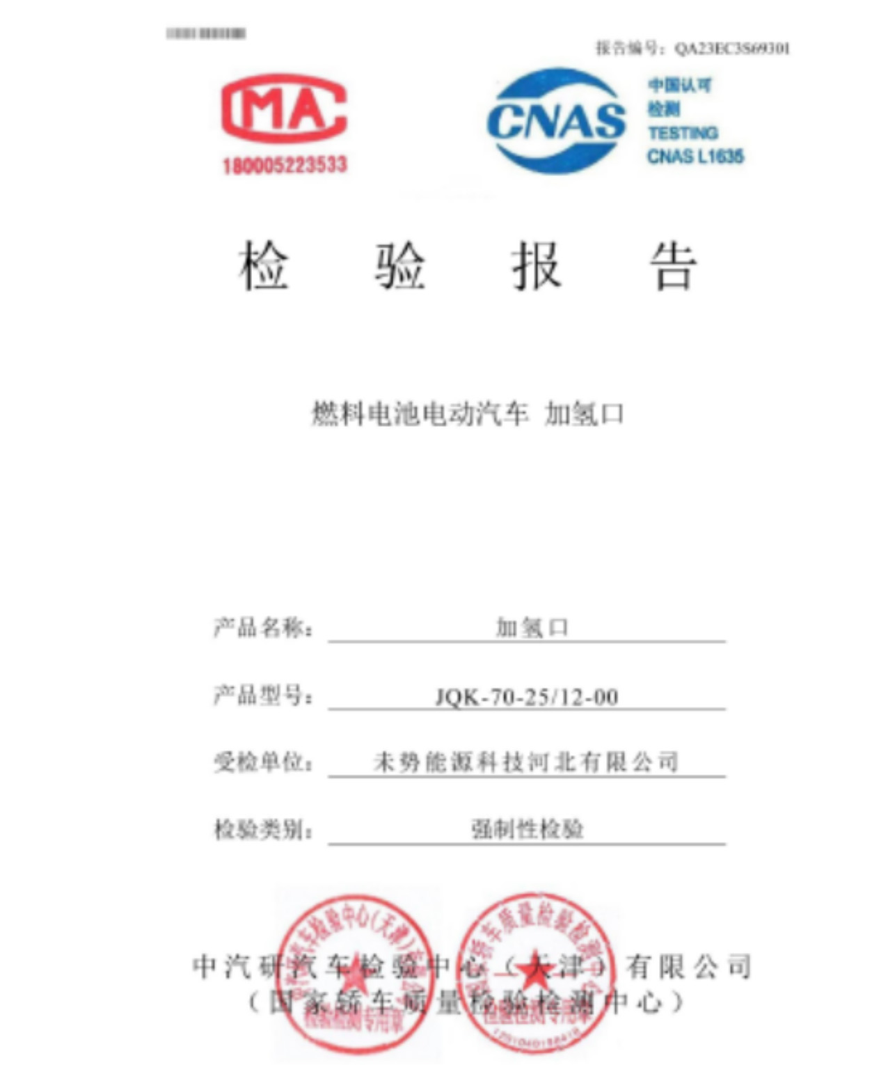 本次順利通過國家強檢認證,標志著未勢能源加氫口產品已完全滿足市場準入條件,具備了生產銷售資質,同時也標志著未勢能源加氫口在產品質量和安全性能方面,已處于業內領先水平。