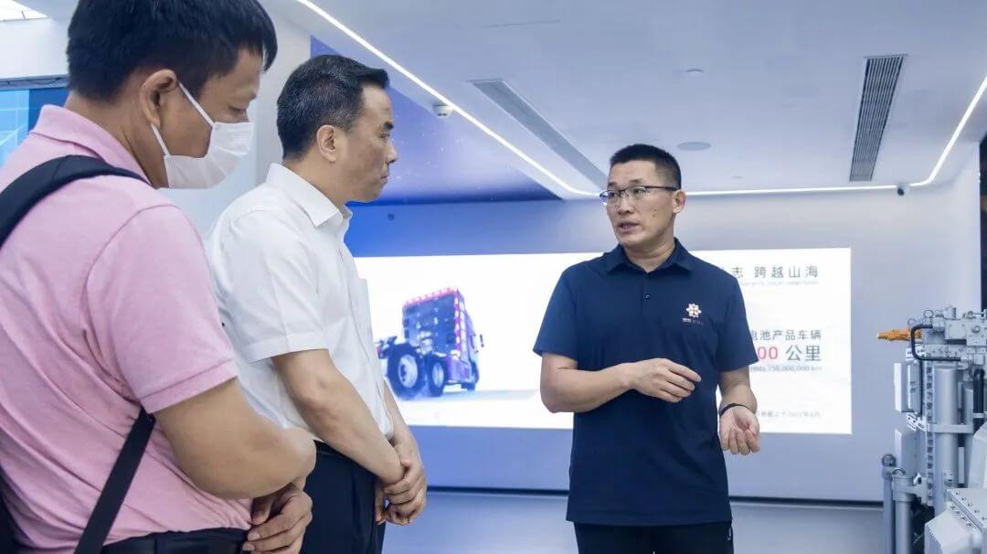 凌逸群一行首先參觀了國(guó)鴻氫能企業(yè)展廳,詳細(xì)了解國(guó)鴻氫能的企業(yè)發(fā)展歷程、科技創(chuàng)新成果、全球市場(chǎng)應(yīng)用情況。在聽取副總經(jīng)理劉志祥的介紹后,凌逸群對(duì)國(guó)鴻氫能的發(fā)展成績(jī)表示認(rèn)可。