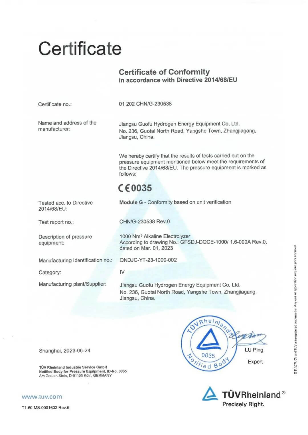[ 導讀 ]氫啟未來網獲悉,國富氫能1000Nm³/h堿性水電解槽產品通過了國際權威的CE認證,獲得了德國萊茵TÜV集團頒發的證書和報告。此...