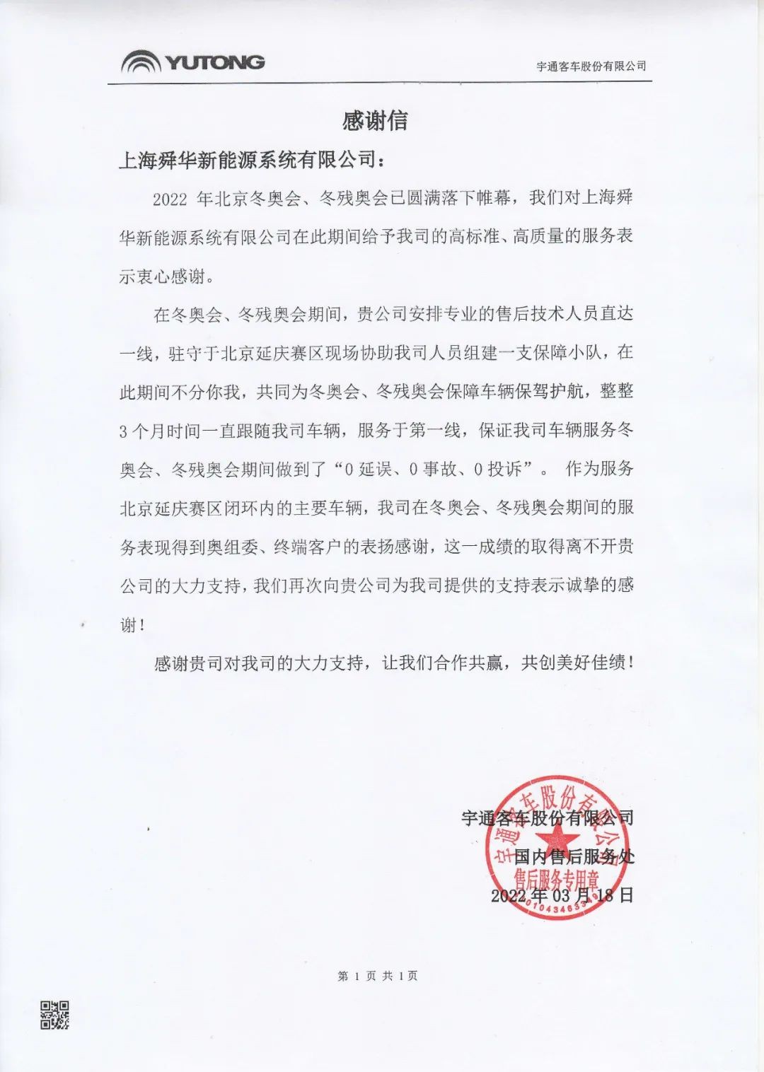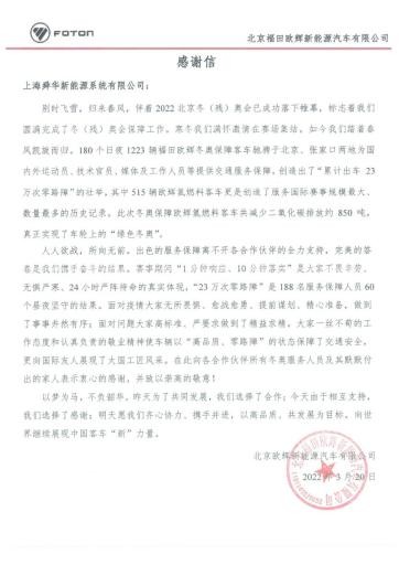冬奧會(huì)后我們陸續(xù)收到來(lái)自多家客戶的感謝信,上海舜華新能源系統(tǒng)有限公司保供專班服務(wù)人員技術(shù)專業(yè)、快速響應(yīng)、高效服務(wù),圓滿地完成了賽事保障工作,贏得了客戶的認(rèn)可。