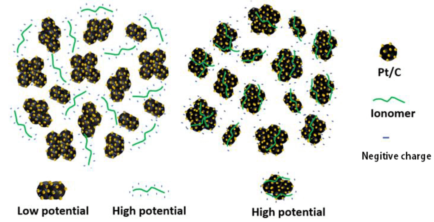 傳統制漿時僅選用單一的醇水體系,制備的催化劑漿料中離聚物僅能以一種狀態存在,無法選擇性調控。眾所周知,離聚物在不同介電常數的溶劑中存在狀態不同,未勢能源開發團隊通過分階段調控漿料中溶劑配比,定向調控離聚物在漿料中的存在狀態,成功實現離聚物在催化劑上的定向吸附。