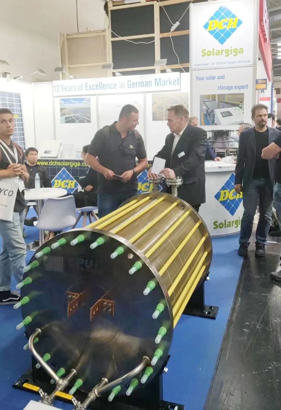 這臺50Nm3/h堿性技術(shù)電解制氫電解槽,由蘇州希倍優(yōu)氫能源科技有限公司供貨,是展會現(xiàn)場唯一的制氫電解槽實物展出,憑借小體積、低電耗吸引了眾多觀展人群的目光,直接引爆A2-640,DCH Solargiga GmbH展臺!